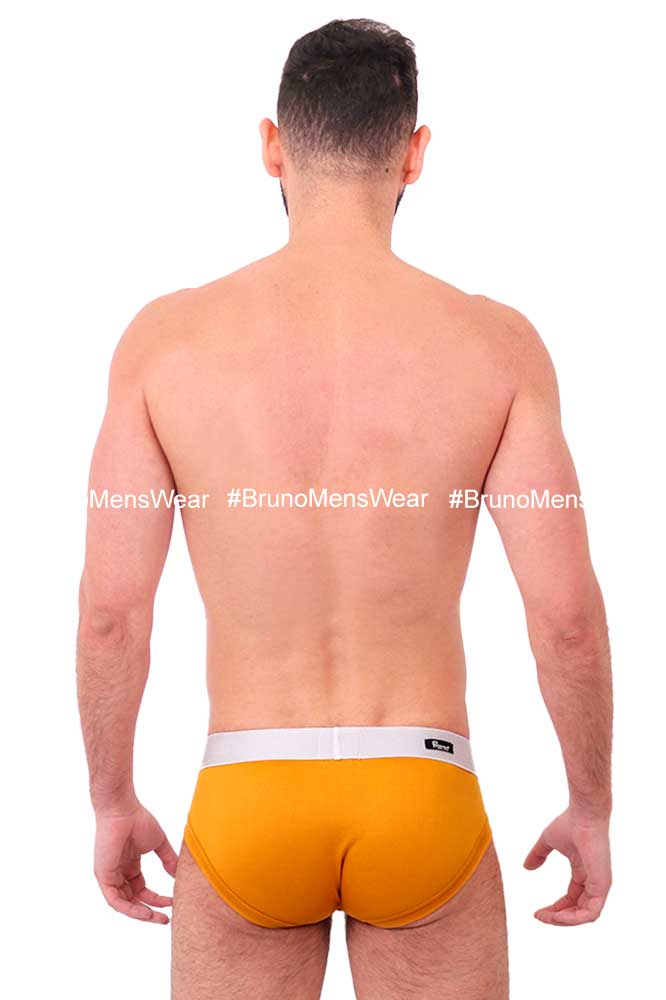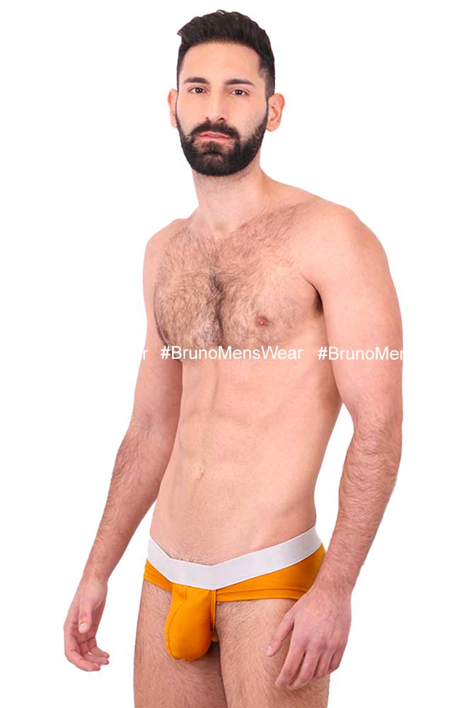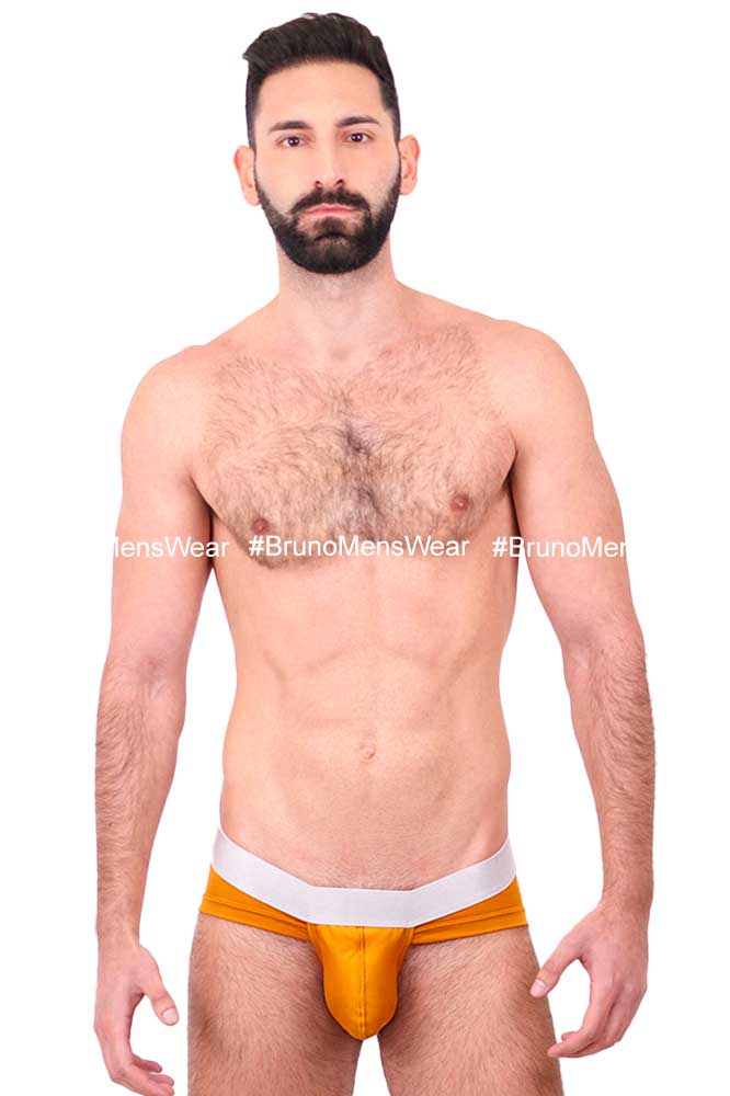 Made of “Silk-Cotton” mustard colored lycra fabric, with “silver” elastic at the waist; with “HIGHLIGHTER BULGE by BrunoMensWear” detail. Cut: Bikini Bulge. Fabric composition: 95% cotton, 5% elastane.