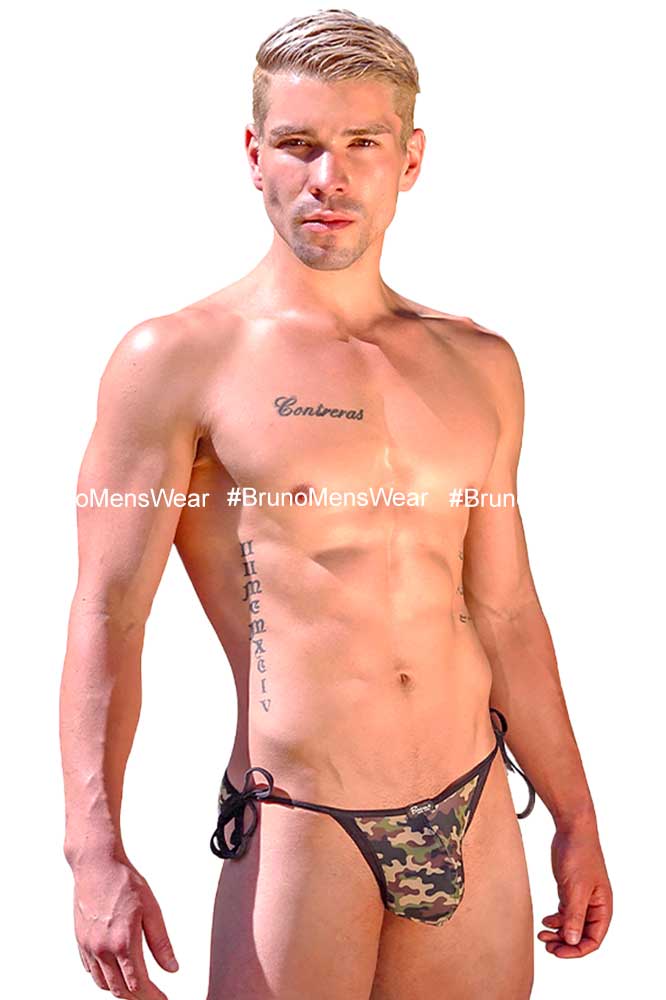Made of camouflage printed polyester lycra, “bulge” cut, with “bias” detail at the waist, between the legs and buttocks in black.