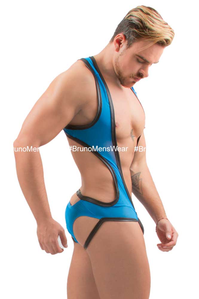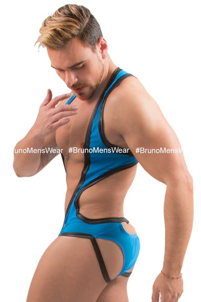 + Free ShippingConfeccionado en licra Mesh color azul turqueza, con detalle de “filos” en contornos y de “bulge”, ambos en tela tipo vinilpiel en tono negro.