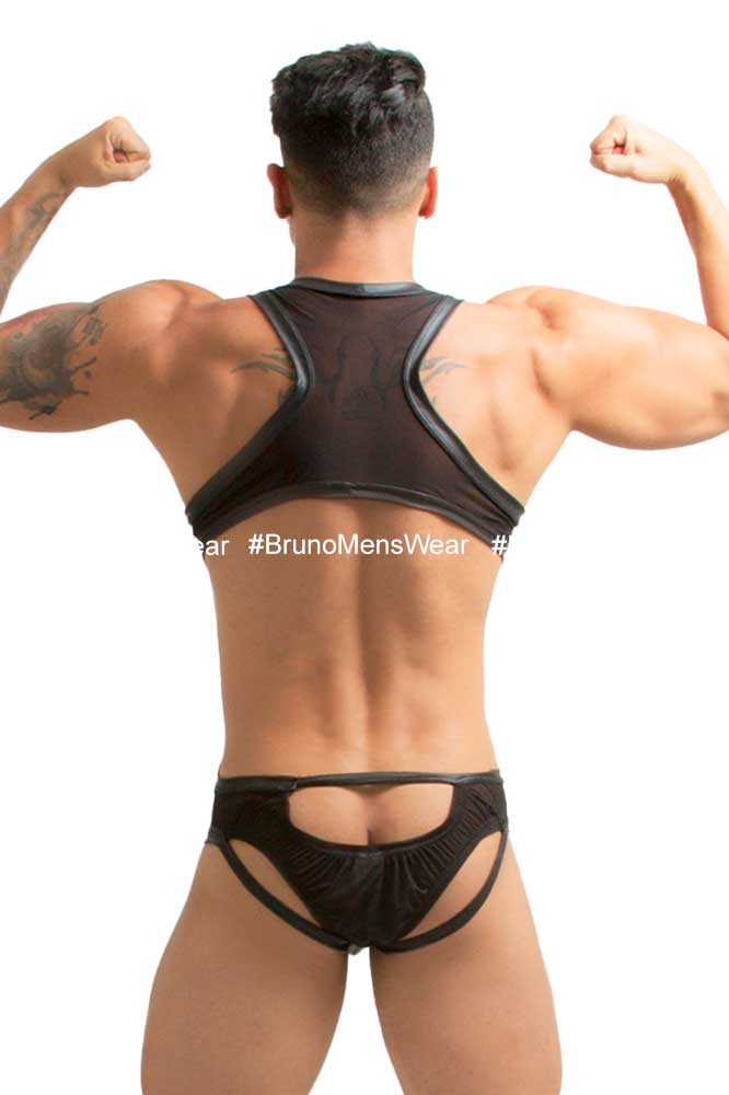Confeccionado en licra Mesh color negro, con detalle de “filos” en contornos y de “bulge”, ambos en tela tipo vinilpiel en tono negro.