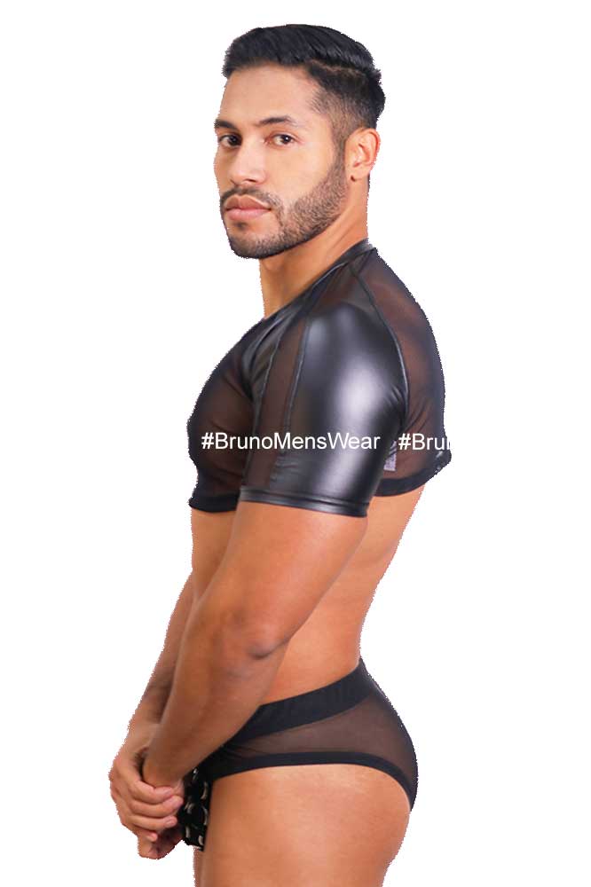 Confeccionada en tela licra tipo “malla red” color negro, combinado en mangas, cuello y dobladillo en tela vinilpiel tono negro.