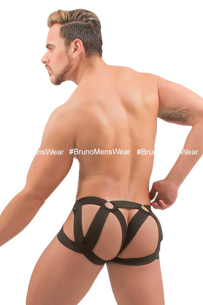 Confeccionado en licra Spandex “Calada” color negro en “bulge” y tirante elástico “ancho” del mismo tono en la entrepierna, cintura y glúteo, con detalle de dos “aros metálicos” en la espalda baja.
