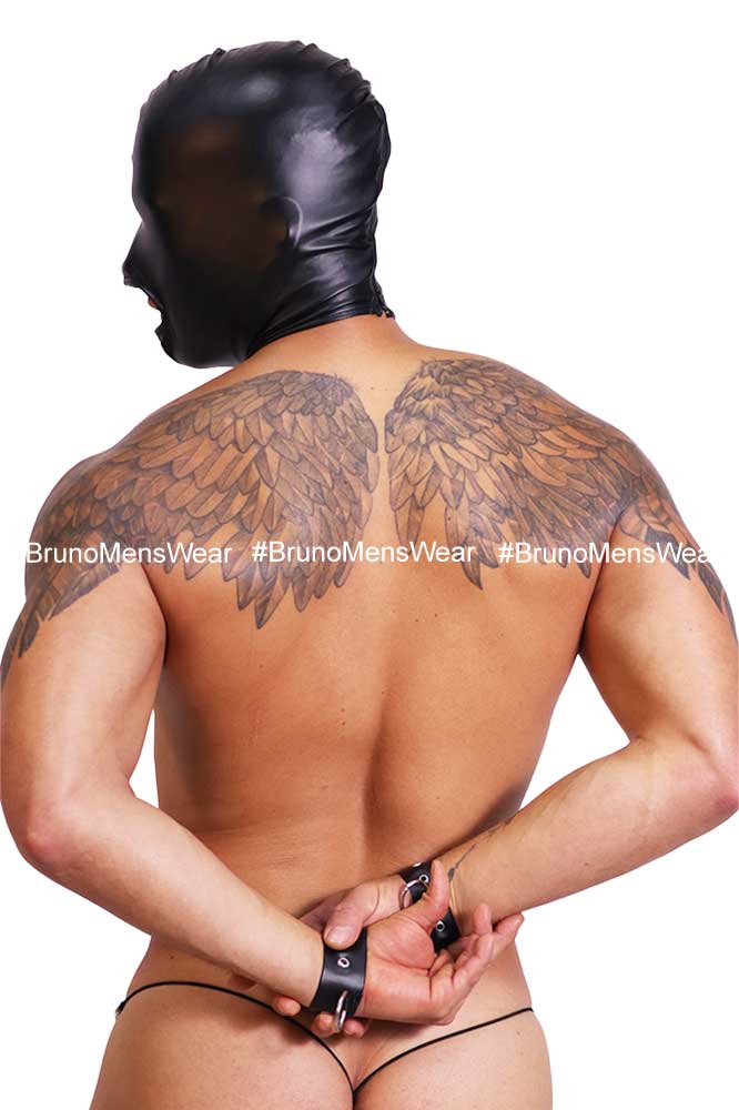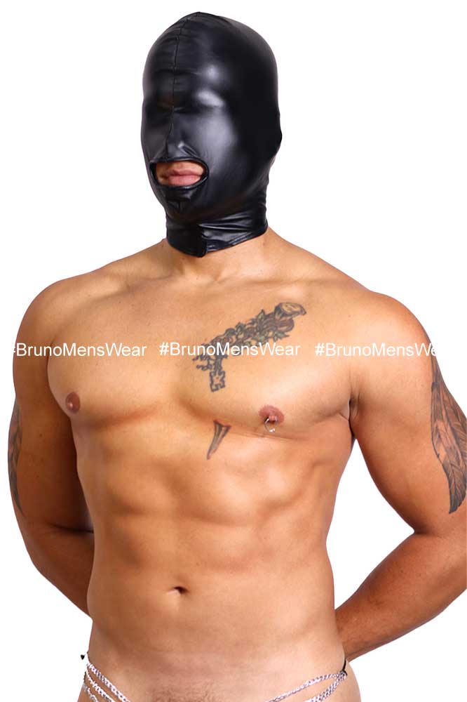 Made in black licra vinylskin fabric, with “mouth opening” and back zipper detail.