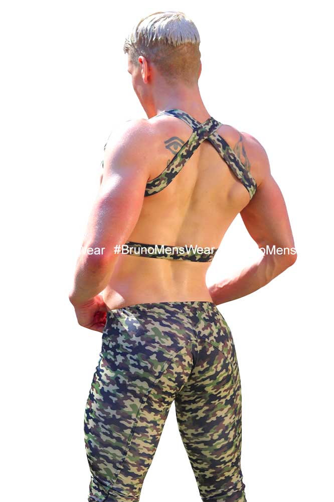 Made of camouflage printed polyester lycra, with details of “stripe” on the right side and lower “views” on both legs in black “Calada” lycra.