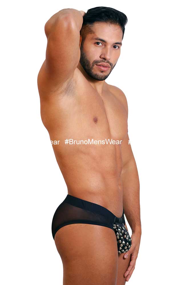 Made in black “Mesh” lycra fabric, combined in “bulge” in black vinylskin lycra fabric, with details of “metallic studs” on “bulge”.