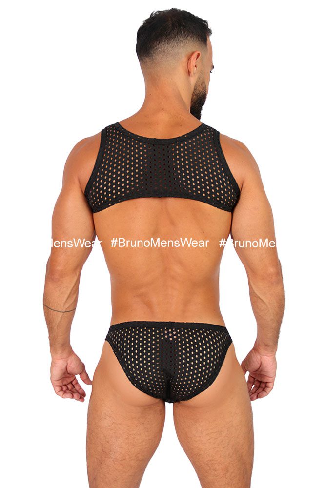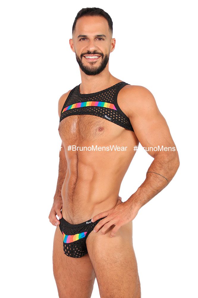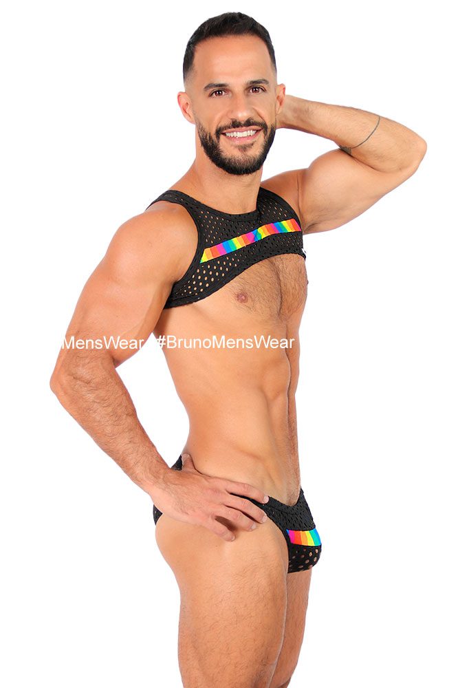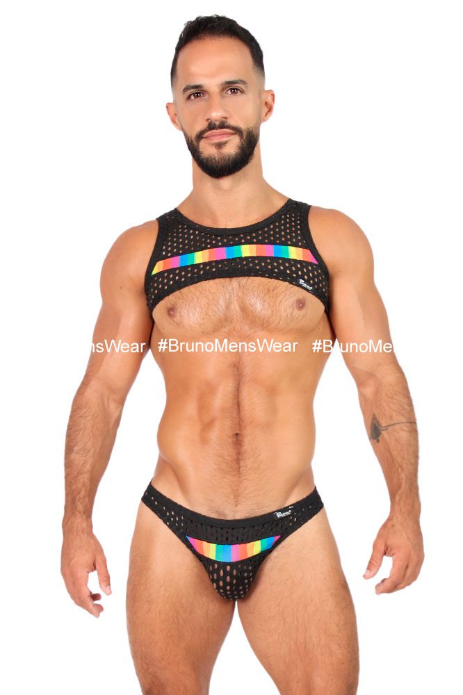 Confeccionada en tela licra “Poliéster Calada” color negro, con detalle de “franja” en tela licra “Poliéster” estampado RAINBOW en pecho. Corte: Crop Top. Composición de la tela: 90% Poliéster, 10% Elastano.