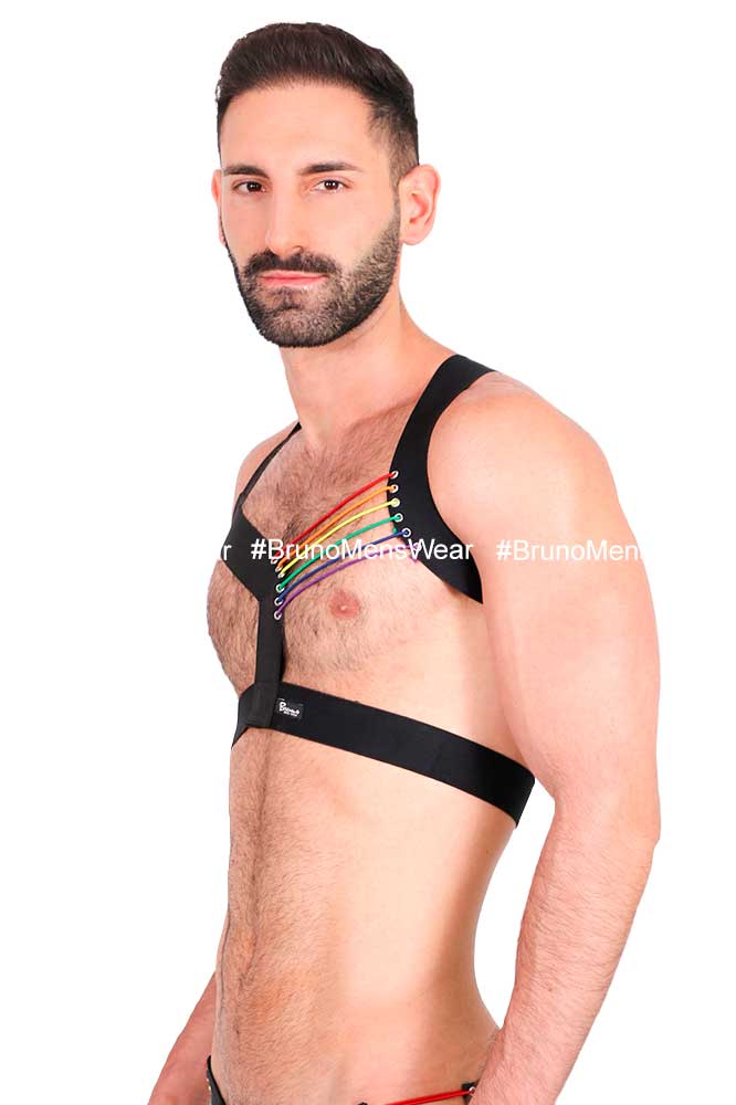 Made in “wide elastic strap” in black with “detail” of circular elastic in “Pride” combination, on left side.