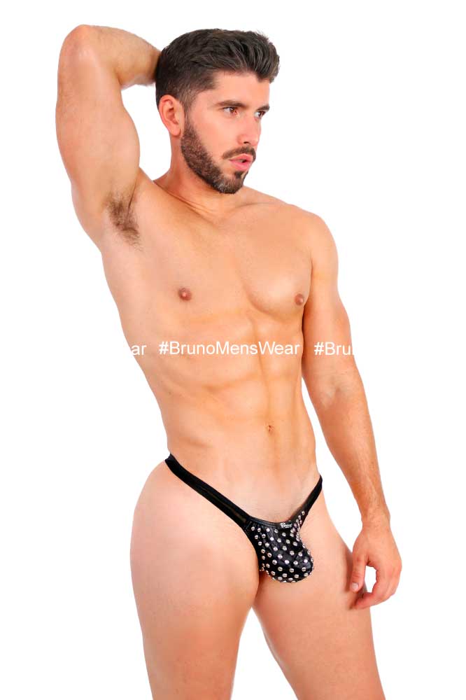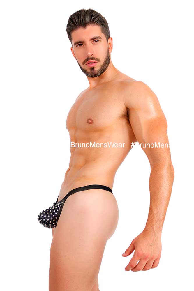 Confeccionada en tela licra “vinipiel” color negro en “Bulge”, combinada en parte trasera con tela licra “Mesh” del mismo tono, con detalle de “estoperoles metálicos” sobre bulge.
