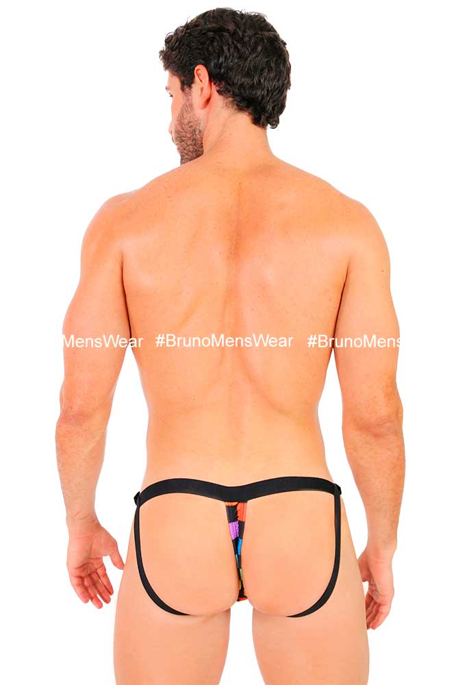 Made in licra fabric “Polyester” printed PRIDE SQUARES, combined with plush elastic in waist and crotch black color, with details of “metallic buckles” adjustable in both sides.