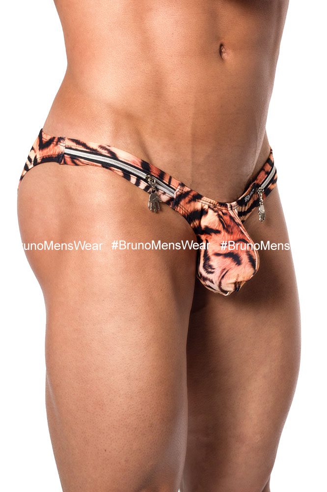 Made in TIGER printed “Polyester” lycra fabric, with “silver zippers” detail and “hand” pendulum on both sides. Cut: Bikini Bulge. Fabric composition: 82% Polyester, 18% Spandex.