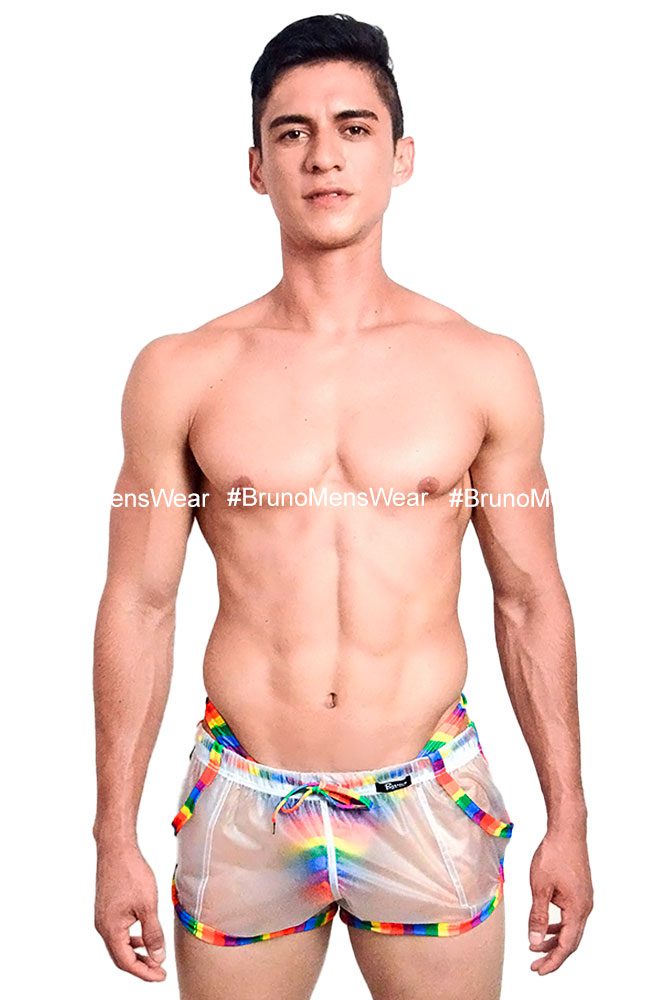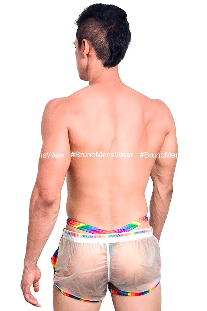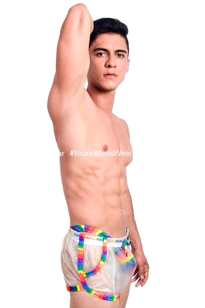 Confeccionado en plástico traslúcido con bolsas en ambos laterales con “detalle” de “bies” de licra SpandexPoliéster estampado rainbow en contornos y cabete ajustable en cintura.
