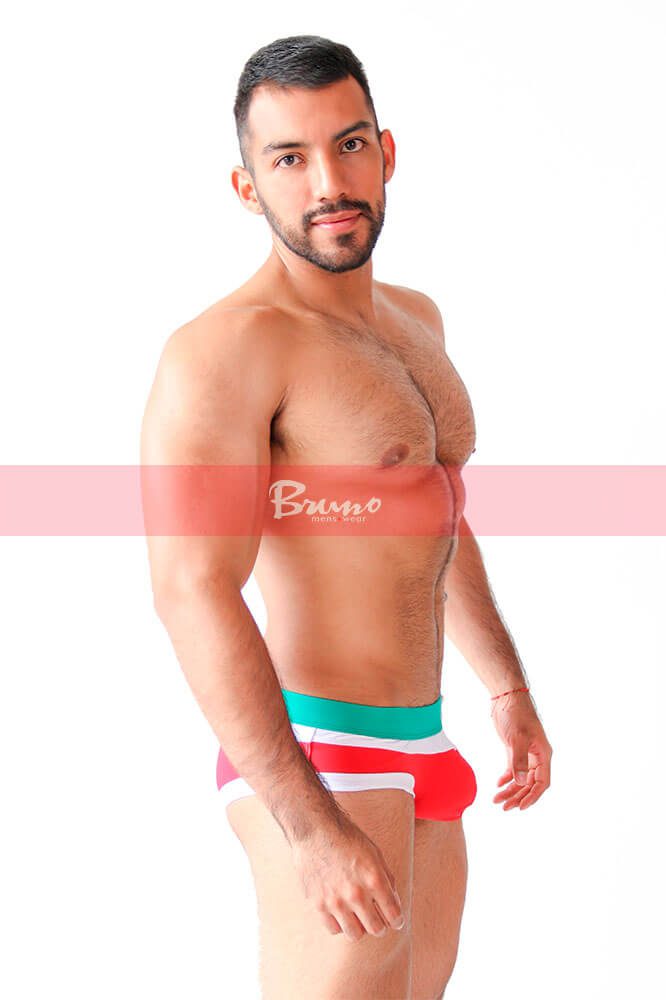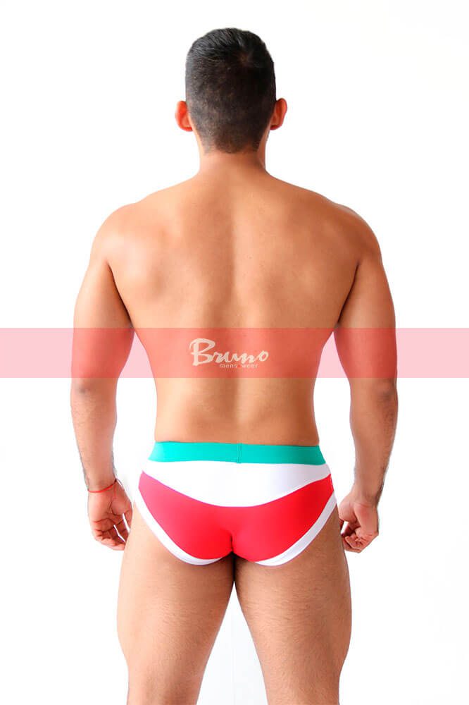 Confeccionado en tela licra “Nylon” “combinado” en colores blanco y rojo con “detalle” de elástico “forrado” en cintura color verde bandera. Corte: Bikini Regula Brief.